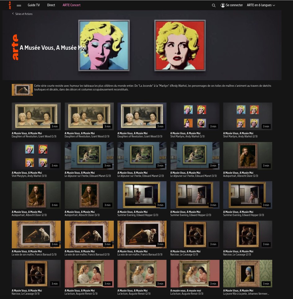 A Musée Vous, A Musée Moi - websérie de la chaine ARTE, indisponible en Belgique.... (Le lien envoie donc sur une capsule youtube où tu pourra en choisir d'autres)