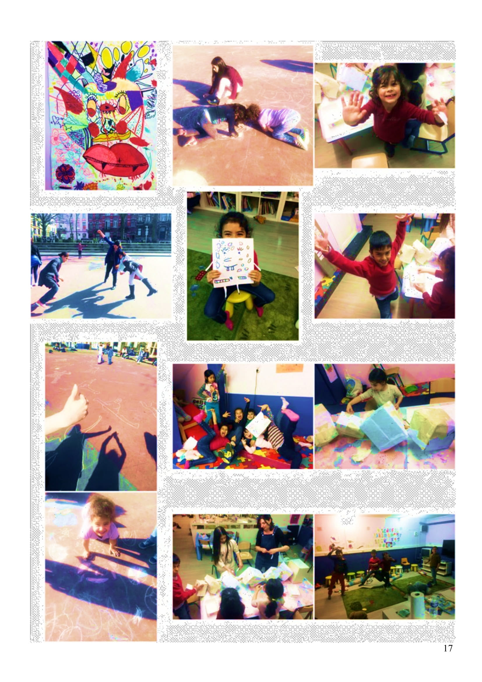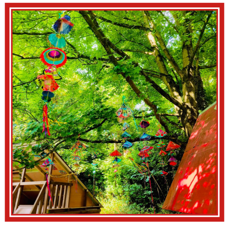 Nous avons donc réalisé avec les habitants, tous âges confondus, des objets/sculptures/chimères de formes diverses et de tailles assez conséquentes accrochées dans les arbres et volant au vent (notamment grace à des rubans type cerf-volant)